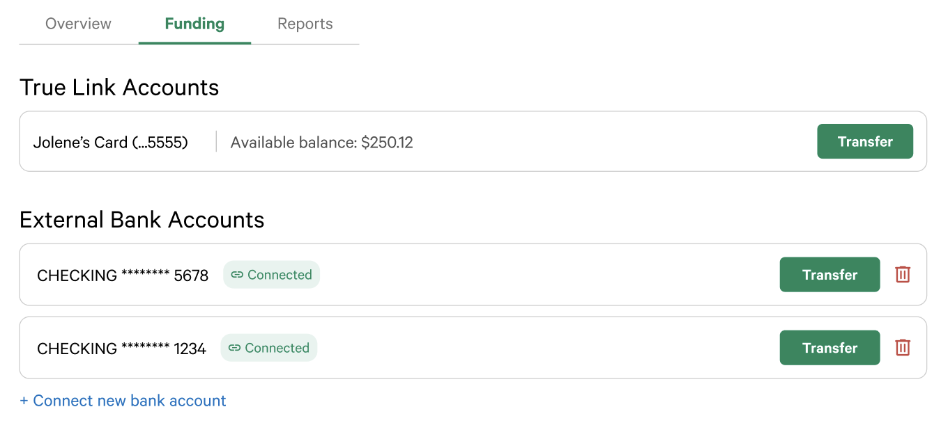 If you would like to take advantage of our flexible transfer tools and have visibility into when the card will be funded, we recommend transferring funds through a connected bank account. To do this, go to your cardholder's dashboard and click on the Funding tab.