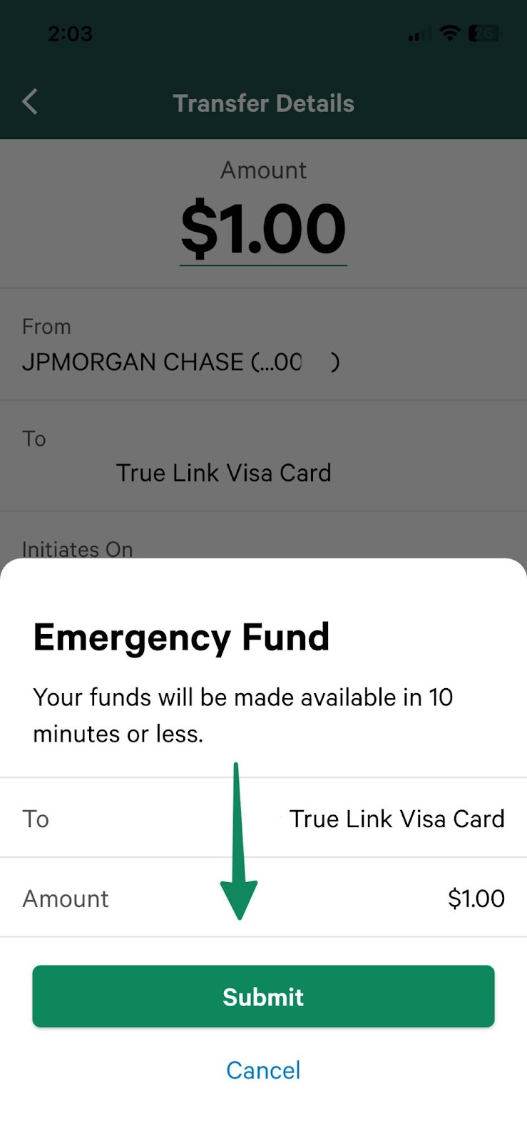 - A pop-up window will appear, sharing that the funds will be made available in ten minutes or less. Tap “Submit”
