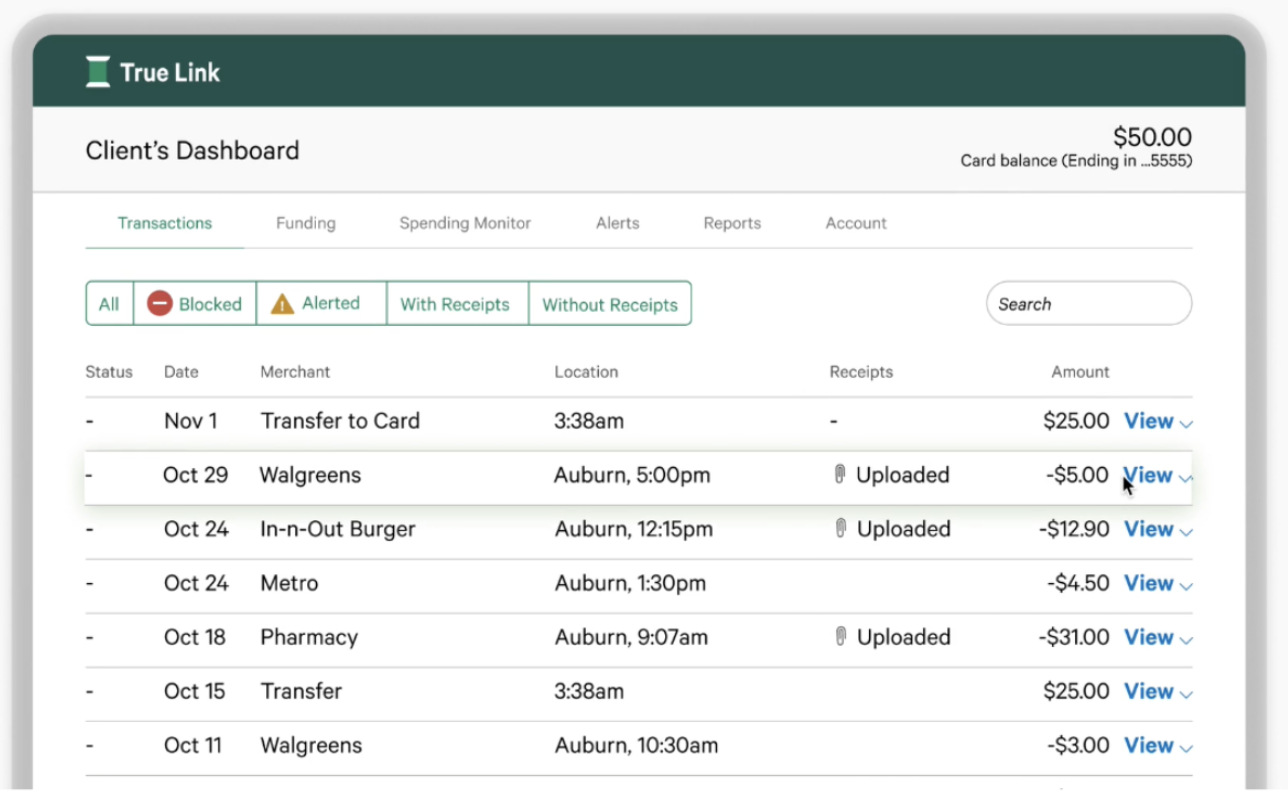 Cardholders and Administrators can then view uploaded receipts from the mobile app or the True Link website/online dashboard.