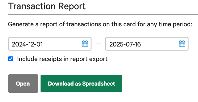- Download as Spreadsheet: A zip file containing both a folder with all the uploaded receipt images for the selected time period in addition to the spreadsheet with the Cardholder’s transactions will be downloaded